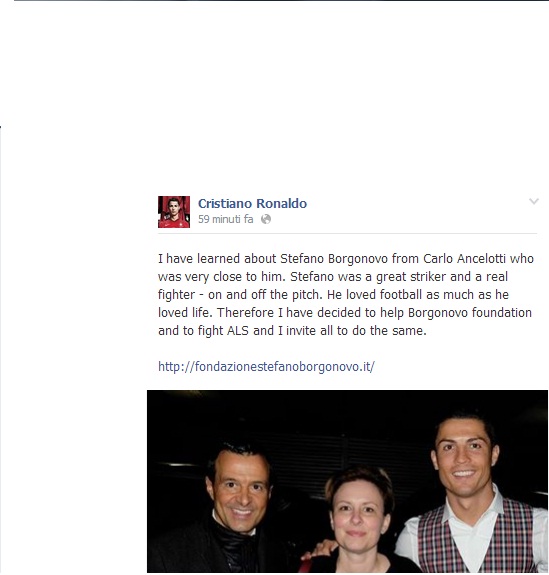 Il pensiero di un campione, per un altro campione. Direttamente dalla propria pagina Facebook, Cristiano Ronaldo spende parole al miele per Stefano Borgonovo: “Ho imparato – scrive il portoghese – a conoscerlo tramite Carlo Ancelotti, che era molto vicino a lui. Stefano è stato un grande attaccante, un vero combattente. Amava il calcio tanto quanto amava la vita. Perciò ho deciso di aiutare la Fondazione Borgonovo, e per combattere la SLA invito tutti a fare lo stesso”. (Gianlucadimarzio.com)