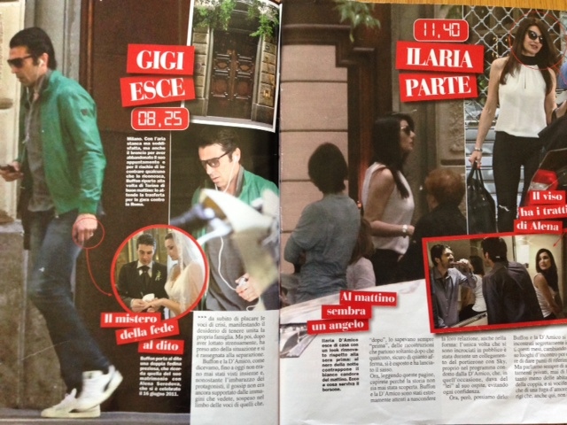 Gigi Buffon e Ilaria D'Amico insieme, "ecco le prove": il settimanale Chi pubblica nel numero in edicola questa settimana le foto dei protagonisti del gossip che impazza da gennaio scorso, colti in un incontro "segreto" a Milano che confermerebbero la loro storia d'amore, ancora mai ufficializzata. Il taglio da spy-story. Il settimanale specializzato in gossip pubblica un ampio servizio fotografico, in esclusiva, dell’incontro segreto fra il portierone carrarino, che si strarebbe separando dalla moglie, Alena Seredova, e la conduttrice di Sky. "Buffon&D'Amico, notte segreta", è il titolo. Segreta ma non troppo, verrebbe da dire. Secondo quanto raccontato dal settimanale diretto da Alfonso Signorini, che dedica otto pagine allo scoop, i due si sono incontrati prima che lui partisse per la trasferta con la Juventus a Roma e lei partecipasse a un convegno sulla “Bellezza del potere”. Ora per ora. In effetti le foto, sembrano non lasciare molto spazio ai dubbi: il servizio ha il taglio di una spy story e mette in sequenza gli scatti dell’arrivo di lei, immortalata mentre infila le chiavi nel portone di un elegante palazzo nel centro del capoluogo lombardo, indicando l’ora (le 21,15), seguito pochi minuti dopo da quello del numero uno della Juventus e della Nazionale (le 21,35). Look dark aggressivo per lei (scivolata rapidamente fuori da un taxi), con gonna nera e tacchi vertiginosi; più sportivo lui, in jeans e giubbotto verde, che ha parcheggiato il Suv “aziendale” poco lontano, con tanto di auricolare. Entrambi hanno una borsa da viaggio, che può contenere il cambio per la notte.