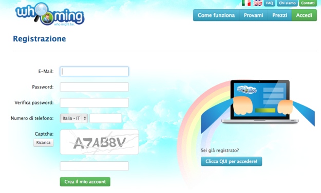 Nulla è facile come scoprire il numero privato con Whooming. Tutto quello che devi fare è collegarti alla pagina iniziale del servizio e cliccare prima sul pulsante Accedi collocato in alto a destra e poi su Attiva subito, è GRATIS!. Compila quindi il modulo che ti viene proposto, digitando il tuo indirizzo email, il tuo numero di cellulare (o telefono fisso) e la password che vuoi usare per accedere al servizio, immetti il codice captcha di verifica nell’apposito campo e clicca sul pulsante Crea il mio account per proseguire.