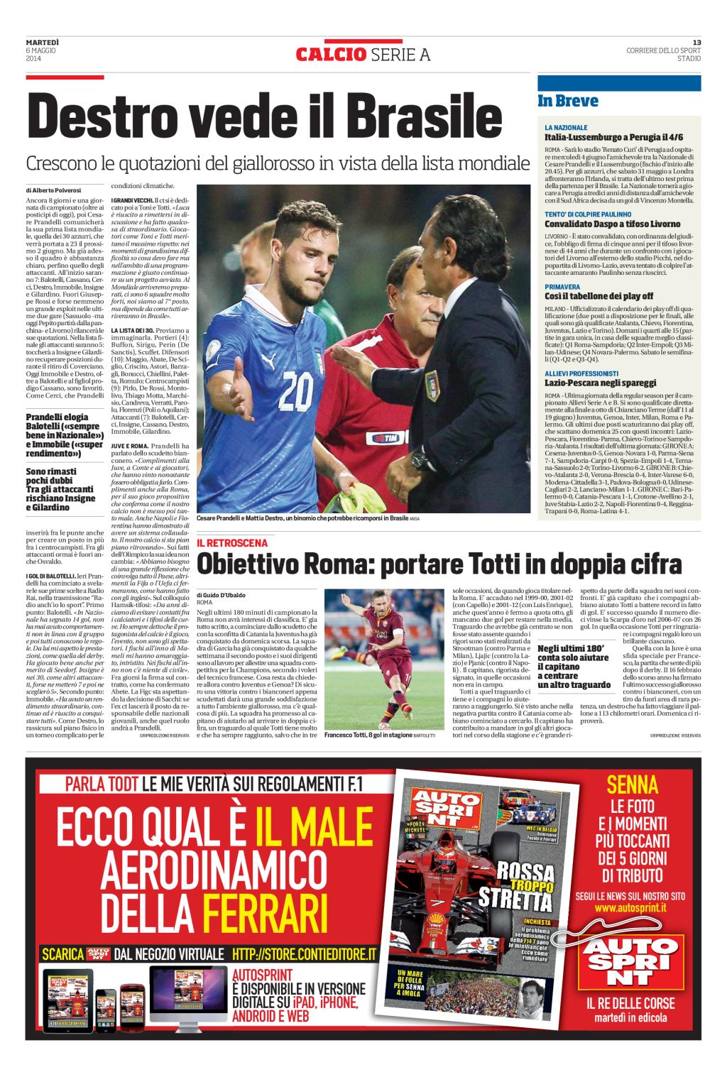 ROMA - Il mondiale si avvicina. Ecco come il Corriere dello Sport nell'edizione di oggi alla pagina 13, torna sull'argomento Mattia Destro. Non si parla però della squalifica (che già ha fatto discutere e non poco), ma di una sua eventuale chiamata in azzurro da parte del c.t. Cesare Prandelli.…