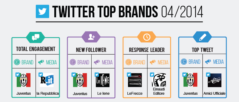 "Come da inizio stagione a questa parte, anche in aprile la Juventus ha fatto il vuoto dietro di sé nelle classifiche di categoria dei social network, confermandosi il profilo più engaging fra i brand del Paese su Twitter; anche su Facebook, inoltre, il brand è stato quello in grado di attrarre più follower e quello che ha pubblicato il contenuto più condiviso e commentato in assoluto.