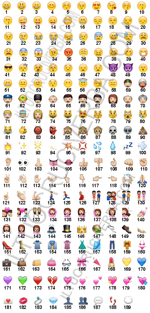 Ecco tutti i 189 emoticon della categoria persone. Ogni emoticon è contraddistinto da un un numero. Sotto l’immagine troverai l’elenco numerato con la spiegazione di tutti i simboli, faccine, smail emoticon di whatsapp emoji