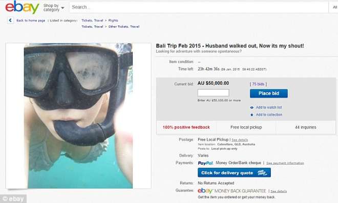 Prenota un viaggio romantico per lei e suo marito a Bali, ma la dolce metà la lascia. Sarah-Jane Bell ha deciso di non rinunciare comunque alla sua vacanza e ha scritto su eBay un singolare annuncio. «Cercasi compagno/a per una vacanza (romantica) di nove giorni a Bali». La ragazza autraliana aveva già tutto in programma: biglietti aerei, alloggi in un resort di Kuta e soprattutto voglia di trascorrere quella decina di giorni con l’uomo che pensava l’amasse.