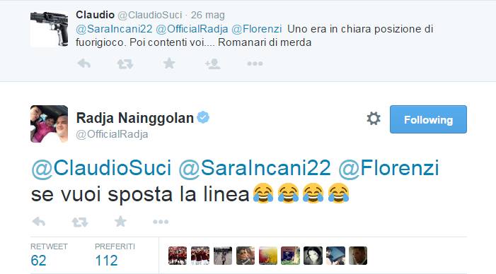 ROMA - Radja Nainggolan, centrocampista della Roma, risponde a un tifoso della Lazio su Twitter che gli ricordava la posizione di fuorigioco di alcuni giocatori della Roma durante il gol partita di Yanga-Mbiwa nell'ultimo derby capitolino disputato lo scorso 25 maggio. La risposta del giocatore ex Cagliari non si è fatta attendere: "Se vuoi sposta la linea".