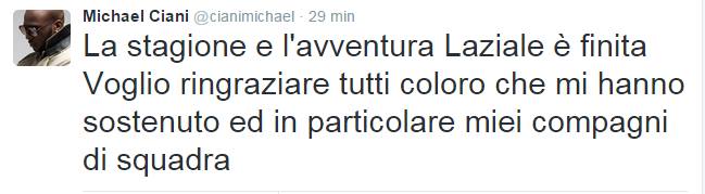 ROMA - Michael Ciani lascia la Lazio dopo aver recitato il ruolo di comprimario e non avendo mai creato problemi allo spogliatoio. Ricorderemo sempre quella sua capocciata contro il Siena che ha permesso alla Lazio di proseguire l'avventura in Coppa Italia vinta ai danni della Roma nel 2013: "La stagione e l'avventura Laziale è finita Voglio ringraziare tutti coloro che mi hanno sostenuto ed in particolare miei compagni di squadra", questo il messaggio che ha lasciato sul suo profilo Twitter.
