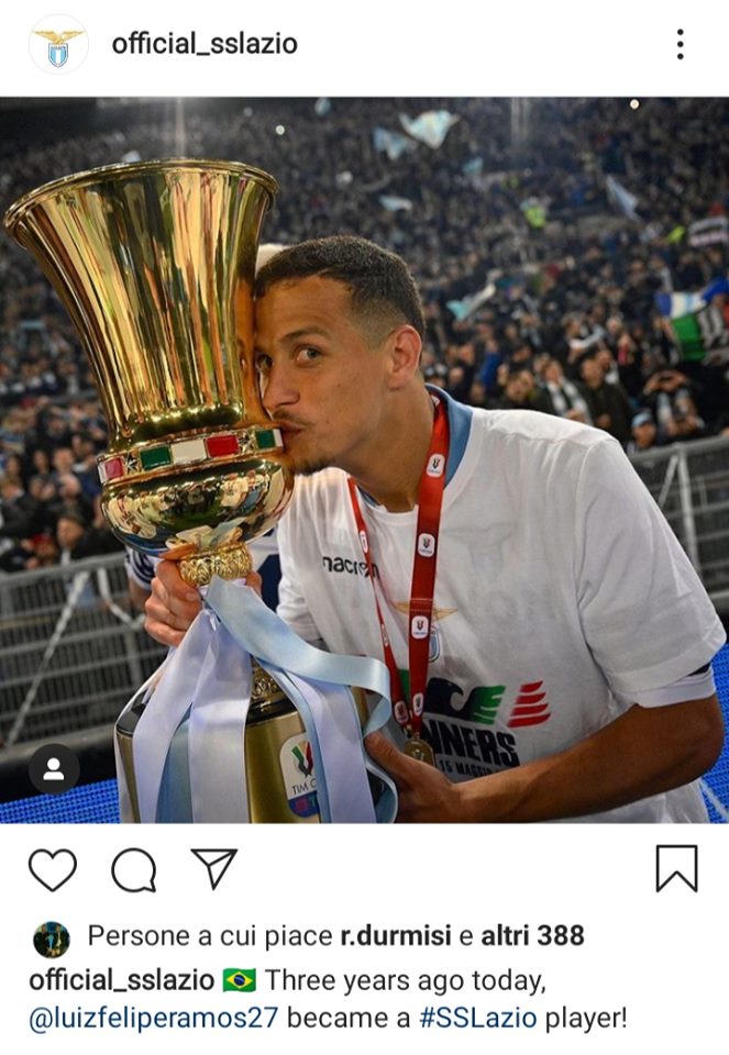 La società biancoceleste sul proprio profilo instagram ricorda l'arrivo a Roma di Luiz Felipe Ramos