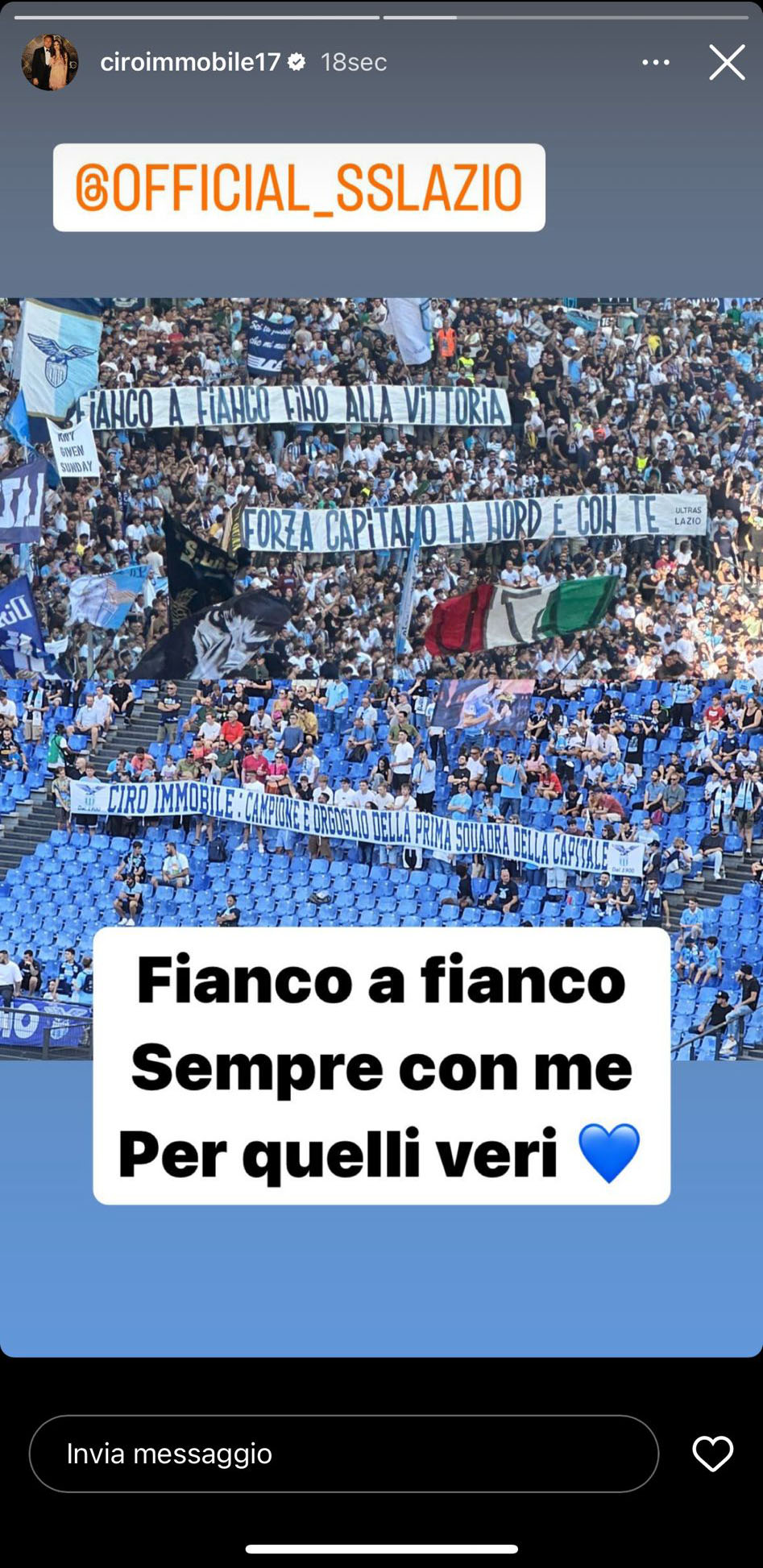 “I veri laziali mi hanno sempre riconosciuto prima come persona e poi come calciatore, lo abbiamo visto anche domenica grazie agli striscioni” - ha affermato Immobile. Un aspetto sul quale è voluto tornare ad esprimersi anche attraverso il proprio profilo social. Il capitano con storia Instagram ha condiviso una foto degli striscioni a lui dedicati, dedicando un messaggio ai tifosi che lo hanno sempre supportato: “Fianco a fianco. Sempre con me. Per quelli veri”.
