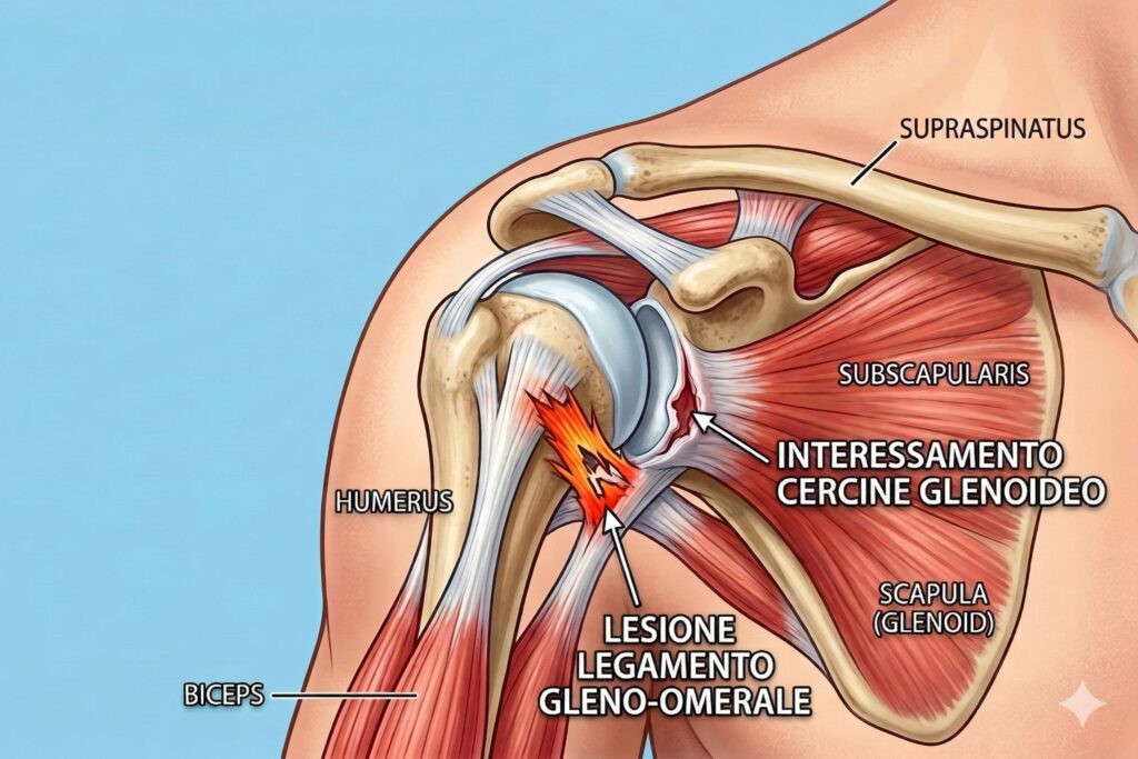 Il legamento gleno-omeriale collega l'omero alla scapola ed impedisce alla spalla di spostarsi troppo in avanti, in basso o indietro. Il cercine glenoideo, invece, è un anello di fibrocartilagine che circonda la glenoide (una superficie articolare di forma ovale situata nella parte laterale della scapola, su cui poggia l'omero) e serve a renderla più profonda. Un infortunio del genere è spesso associato ad una lussazione o ad un forte trauma da impatto e per un portiere significa dolore acuto durante i rilanci lunghi o le parate sopra la testa, sensazione di scatto o rumori articolari durante il movimento e perdita di forza.