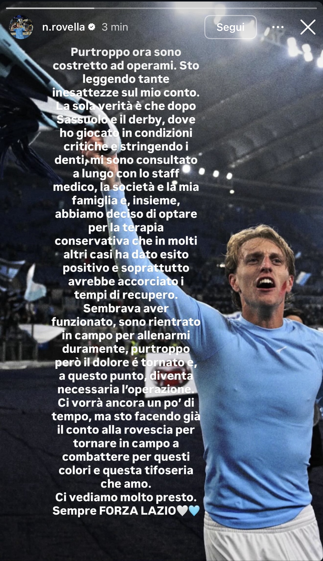 Torna a parlare Nicolò Rovella. Il centrocampista della Lazio si affida a una storia Instagram per spiegare la dinamica che lo ha portato alla scelta di operarsi per risolvere la pubalgia. Queste le sue parole: “Purtroppo ora sono costretto ad operami. Sto leggendo tante inesattezze sul mio conto. La sola verità è che dopo Sassuolo e il derby, dove ho giocato in condizioni critiche e stringendo i denti, mi sono consultato a lungo con lo staff medico, la società e la mia famiglia e, insieme, abbiamo deciso di optare per la terapia conservativa che in molti altri casi ha dato esito positivo e soprattutto avrebbe accorciato i tempi di recupero. Sembrava aver funzionato, sono rientrato in campo per allenarmi duramente, purtroppo però il dolore é tornato e, a questo punto, diventa necessaria l'operazione. Ci vorrà ancora un po' di tempo, ma sto facendo già il conto alla rovescia per tornare in campo a combattere per questi colori e questa tifoseria che amo. Ci vediamo molto presto. Sempre FORZA LAZIO”.