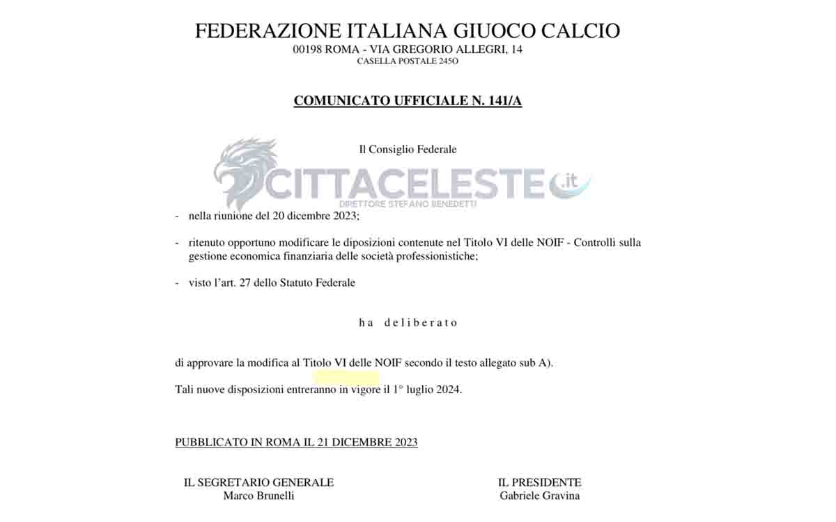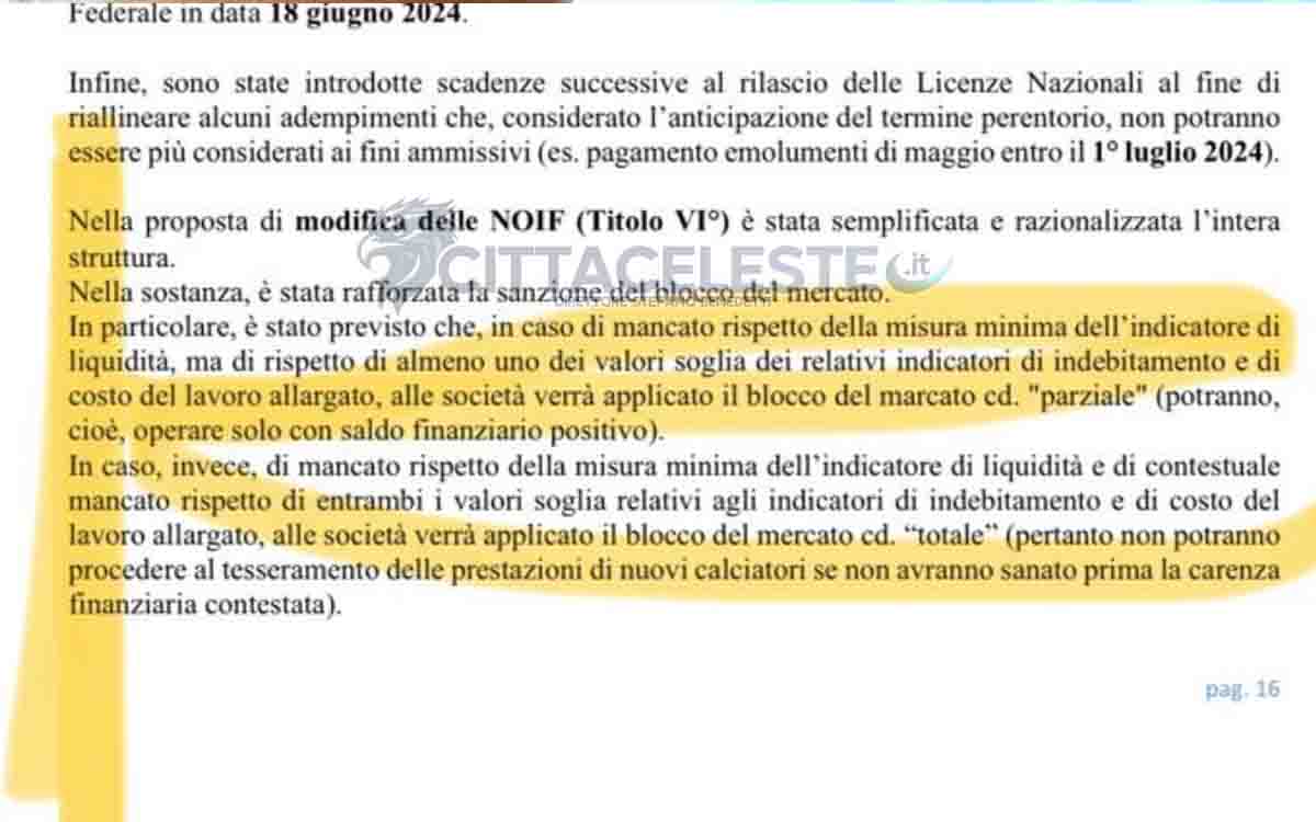 "Nella proposta di modifica delle NOIF (Titolo VI°) è stata semplificata e razionalizzata l’intera struttura. Nella sostanza, è stata rafforzata la sanzione del blocco del mercato. In particolare, è stato previsto che, in caso di mancato rispetto della misura minima dell’indicatore di liquidità, ma di rispetto di almeno uno dei valori soglia dei relativi indicatori di indebitamento e di costo del lavoro allargato, alle società verrà applicato il blocco del mercato cd. “parziale” (potranno, cioè, operare solo con saldo finanziario positivo). In caso, invece, di mancato rispetto della misura minima dell’indicatore di liquidità e di contestuale mancato rispetto di entrambi i valori soglia relativi agli indicatori di indebitamento e di costo del lavoro allargato, alle società verrà applicato il blocco del mercato cd. “totale” (pertanto non potranno procedere al tesseramento delle prestazioni di nuovi calciatori se non avranno sanato prima la carenza finanziaria contestata)".