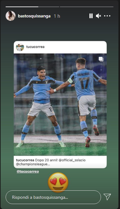 La Lazio raggiunge gli ottavi di finale di Champions per la terza volta nella sua storia. Fondamentale il pareggio casalingo di ieri con il Bruges che ha regalato ai biancocelesti il pass definitivo per il prestigioso traguardo. L'ex difensore dei capitolini Bastos Quissanga, attualmente nelle file dell'Al-Ain Saudi, si è congratulato con i compagni sui social, ripostando fra le proprie stories di Instagram quella di Correa che festeggia il gol.