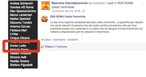 Chiaro il riferimento al dirigente federale, già al centro delle altrettante e più famose polemiche dopo la telefonata con Iodice. Beh, incredibile, ma vero, tra i “Mi piace” del post c’è anche quello di Enrico Lotito, figlio del presidentissimo, che si è “schierato” dalla parte della Lazio femminile. Che ci sia una congiura contro di lui anche all’interno della sua famiglia? (http://www.lultimaribattuta.it)