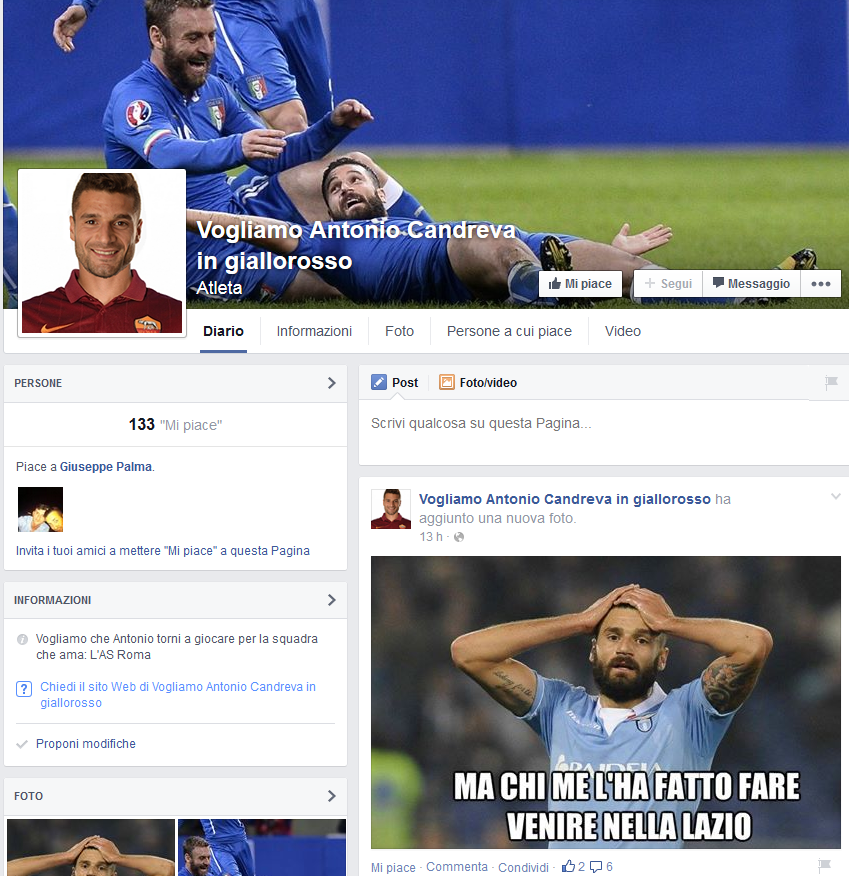 ROMA - E' spuntata così, improvvisamente, e ha già '133' adepti. Tredici ore fa, su Facebook, è stata creata la pagina: Vogliamo Antonio Candreva in giallorosso. All'interno fotomontaggi e foto di rito, come quella di Candreva e De Rossi insieme. Laziali naturalmente a metà fra la rabbia e lo stupore, con chi sorride all'iniziativa giallorossa esclamando: "Madò, come state".