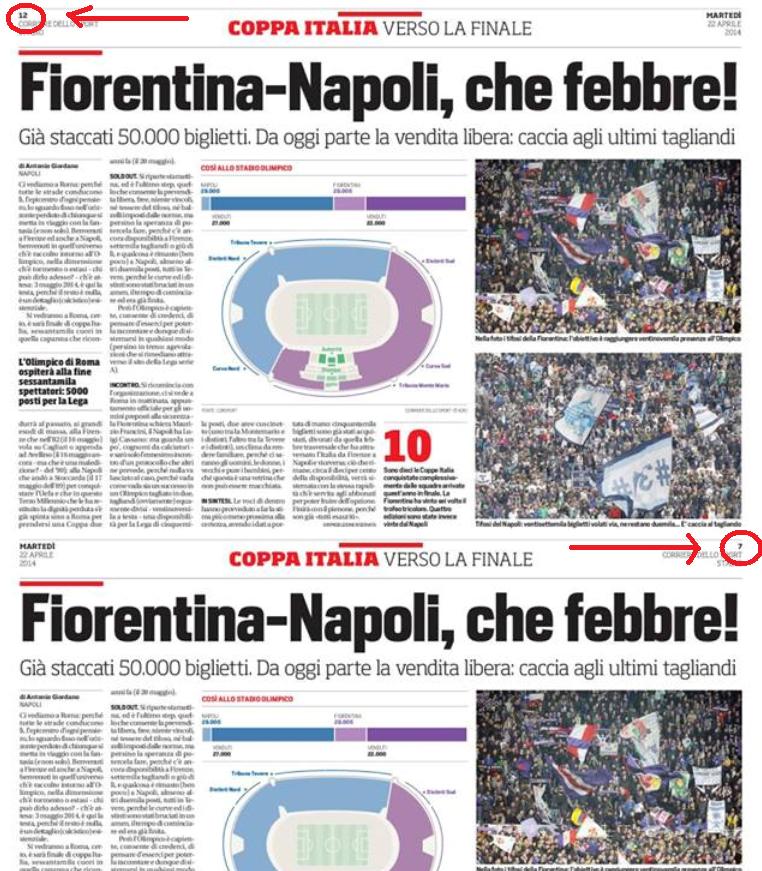 ROMA - Scelta editoriale? No, questa volta un errore almeno sulla edizione digitale scaricabile con abbonamento dal sito corrieredellosport.it. Appare a pagina 7 la notizia riguardante la finale di Coppa Italia tra Napoli e Fiorentina. Si continua a sfogliare, ed eccola che la notizia riappare stile copia e incolla alla pagina numero 12. A volte si dice che i giornali debbano riempire a forza le loro pagine...ma così ci sembra veramente troppo. Passateci la battuta.
