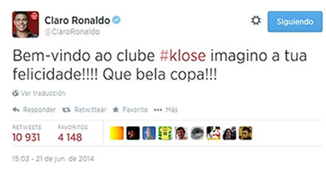 ROMA - 15 gol. Eccoli li, in vetta, Ronaldo il 'Fenomeno' e Klose il 'Panzer'. Un traguardo importante, difficile da agguantare e ora ad un passo dall'esser superato. Miro Klose vuole almeno 3 realizzazioni in questa rassegna intercontinentale, l'ultima della sua carriera. A Ronaldo, ritiratosi da tempo, non resta che lo spazio, su Twitter, per fare i complimenti: "Benvenuto nel club. Posso immaginare la tua felicità #klose. Che grande Coppa del Mondo!".