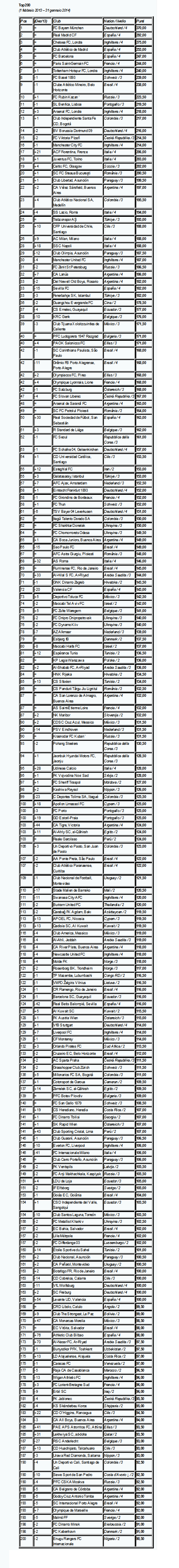 Pos (Dec/13) Club Nation / livello Punti 1 = FC Bayern München Deutschland / 4 370,00 2 = Real Madrid CF España / 4 292,00 3 = Chelsea FC, Londra Inghilterra / 4 275,00 4 = Club Atlético de Madrid España / 4 253,00 5 = FC Barcelona España / 4 247,00 6 = Paris Saint-Germain FC Francia / 4 244,00 7 + 1 Tottenham Hotspur FC, Londra Inghilterra / 4 240,00 8 - 1 FC Basel 1893 Schweiz / 3 239,00 9 - 1 Clube Atlético Mineiro, Belo Horizonte Brasil / 4 238,00 10 + 1 FC Rubin Kazan ‘ Russia / 3 223,50 11 - 1 SL Benfica, Lisboa Portogallo / 3 219,50 12 + 3 Arsenal FC, Londra Inghilterra / 4 218,00 13 + 1 Club Independiente Santa Fe CD, Bogotá Colombia / 3 217,00 14 - 2 BV Borussia Dortmund 09 Deutschland / 4 216,00 15 - 2 FC Viktoria Plzeň Česká Republika / 3 214,50 16 - 1 Manchester City FC Inghilterra / 4 214,00 17 + 21 ACF Fiorentina, Firenze Italia / 4 206,00 18 + 1 Juventus FC, Torino Italia / 4 203,00 19 + 4 Celtic FC, Glasgow Scozia / 3 202,00 20 + 1 SC FC Steaua Bucureşti România / 3 200,50 21 + 1 Club Libertad, Asunción Paraguay / 3 199,50 22 + 2 CA Vélez Sársfield, Buenos Aires Argentina / 4 197,00 23 + 4 Club Atlético Nacional SA, Medellín Colombia / 3 195,50 24 - 4 SS Lazio, Roma Italia / 4 194,00 25 = Trabzonspor AŞ Türkiye / 3 193,00 26 + 10 CFP Universidad de Chile, Santiago Cile / 3 188,00 26 + 9 AC Milan, Milano Italia / 4 188,00 28 + 18 SSC Napoli Italia / 4 188,00 29 - 12 Club Olimpia, Asunción Paraguay / 3 187,50 30 - 4 Manchester United FC Inghilterra / 4 187,00 31 - 2 FC Zenit St Petersburg Russia / 3 186,50 32 + 7 CA Lanús Argentina / 4 186,00 33 - 2 Del Newell Old Boys, Rosario Argentina / 4 182,00 33 - 15 Sevilla FC España / 4 182,00 33 - 3 Fenerbahçe SK, Istambul Türkiye / 3 182,00 36 - 2 Guangzhou Evergrande FC Cina / 2 178,50 37 - 4 CS Emelec, Guayaquil Ecuador / 3 177,00 38 - 10 KRC Genk Belgique / 3 176,00 39 - 3 Club Tijuana Xoloitzcuintles de Caliente México / 3 171,50 40 = PFC Ludogorets 1947 Razgrad Bulgaria / 3 171,00 40 + 4 PAOK Salonicco FC Ellas / 3 171,00 42 - 1 SC Corinthians Paulista, São Paulo Brasil / 4 168,00 42 - 11 Grêmio FB Porto Alegrense, Porto Alegre Brasil / 4 168,00 42 + 2 Olympiacos FC, Pireo Ellas / 3 168,00 42 + 4 Olympique Lyonnais, Lione Francia / 4 168,00 42 - 1 FC Salzburg Österreich / 3 168,00 47 - 4 FC Slovan Liberec Česká Republika / 3 167,00 48 = Arsenal de Sarandí FC Argentina / 4 165,00 49 = SC FC Petrolul Ploiesti România / 3 164,00 50 + 30 Real Sociedad de Fútbol, San Sebastián España / 4 163,00 51 + 3 R Standard de Liège Belgique / 3 162,00 52 - 1 FC Seoul Repubblica della Corea / 3 161,00 53 - 1 FC Schalke 04, Gelsenkirchen Deutschland / 4 157,00 54 + 1 CD Universidad Católica, Santiago Cile / 3 153,50 55 + 12 Esteghlal FC Iran / 2 153,00 55 + 3 Galatasaray, Istanbul Türkiye / 3 153,00 57 + 7 AFC Ajax, Amsterdam Nederland / 3 152,50 58 + 1 Eintracht Frankfurt 1893 Deutschland / 4 152,00 58 - 1 FC Girondins de Bordeaux Francia / 4 152,00 58 + 1 FC Thun Schweiz / 3 152,00 61 - 6 TSV Bayer 04 Leverkusen Deutschland / 4 151,00 62 = Itagüí Talento Dorado SA Colombia / 3 150,00 62 = FC Shakhtar Donetsk Ukrayina / 3 150,00 64 = FC Chornomorets Odesa Ukrayina / 3 149,50 65 + 1 CA Boca Juniors, Buenos Aires Argentina / 4 149,00 65 - 15 Sao Paulo FC Brasil / 4 149,00 67 = AFC Astra Giurgiu, Ploiesti România / 3 148,00 68 + 32 AS Roma Italia / 4 146,00 69 = Fluminense FC, Rio de Janeiro Brasil / 4 145,00 70 + 33 Al-Hilal S FC, Ar-Riyad Arabia Saudita / 3 144,00 71 - 1 GNK Dinamo Zagreb Hrvatska / 2 143,50 72 - 20 Valencia CF España / 4 143,00 73 + 5 Deportivo Toluca FC México / 3 142,50 74 - 2 Maccabi Tel Aviv FC Israel / 2 142,00 75 + 5 FC Zulte Waregem Belgique / 3 141,00 76 - 2 FC Dnipro Dnipropetrovsk Ukrayina / 3 140,00 76 - 2 FC Dynamo Kiiv Ukrayina / 3 140,00 78 - 7 AZ Alkmaar Nederland / 3 139,00 79 = Esbjerg fB Danmark / 2 137,50 80 - 8 Maccabi Haifa FC Israel / 2 137,00 81 + 12 Espérance Tunis Tunisia / 2 136,50 82 = KP Legia Warszawa Polska / 2 136,00 82 + 2 Al-Shabab FC, Ar-Riyad Arabia Saudita / 3 136,00 84 = HNK Rijeka Hrvatska / 2 134,50 85 + 13 CS Sfaxien Tunisia / 2 134,00 86 = CS Pandurii Târgu Jiu Lignitul România / 3 132,50 87 = CA San Lorenzo de Almagro, Buenos Aires Argentina / 4 132,00 87 = AS Saint-Étienne Loire Francia / 4 132,00 87 + 2 NK Maribor Slovenija / 2 132,00 90 + 2 CDSC Cruz Azul, Messico México / 3 131,50 90 - 14 PSV Eindhoven Nederland / 3 131,50 90 = Krasnodar FC Kuban ‘ Russia / 3 131,50 93 - 2 Pohang Steelers Repubblica della Corea / 3 130,50 94 + 1 Jeonbuk Hyundai Motors FC, Jeonju Repubblica della Corea / 3 128,50 95 + 28 Udinese Calcio Italia / 4 128,00 95 + 1 FK Vojvodina Novi Sad Srbija / 2 128,00 97 + 1 FC Sheriff Tiraspol Moldova / 2 127,00 98 + 2 Kashiwa Reysol Nippon / 3 126,00 99 - 23 C Deportes Tolima SA, Ibagué Colombia / 3 125,50 100 + 18 Apollon Limassol FC Cypern / 3 125,00 100 - 3 FC Porto Portogallo / 3 125,00 100 + 19 GD Estoril-Praia Portogallo / 3 125,00 103 - 44 CA Tigre, Victoria Argentina / 4 124,00 103 + 11 Al-Ahly SC, al-Qāhirah Egitto / 2 124,00 103 = Reale Garcilaso Perú / 2 124,00 106 + 3 Un Deportivo Pasto, San Juan de Pasto Colombia / 3 123,00 107 - 2 AA Ponte Preta, São Paulo Brasil / 4 122,00 107 - 2 Club Atlético Paranaense, Curitiba Brasil / 4 122,00 109 - 1 Club Nacional de Football, Montevideo Uruguay / 2 121,50 110 - 17 Stade Malien de Bamako Mali / 2 120,50 111 - 11 Swansea City AFC Inghilterra / 4 120,00 111 - 2 Buriram United FC Thailandia / 2 120,00 113 - 2 Qarabağ FK Agdam, Bakı Azärbaycan / 2 119,50 113 + 13 APOEL FC, Nicosia Cypern / 3 119,50 113 + 13 Qadisia SC, Al Kuwait Kuwait / 2 119,50 116 - 4 Club America, Messico México / 3 119,00 116 - 4 Al-Ahli, Jeddah Arabia Saudita / 3 119,00 118 - 4 CA River Plate, Buenos Aires Argentina / 4 118,00 118 - 4 Newcastle United FC Inghilterra / 4 118,00 118 - 4 Molde FK Norge / 3 118,00 121 - 2 Rosenborg BK, Trondheim Norge / 3 117,00 122 - 1 TP Mazembe, Lub