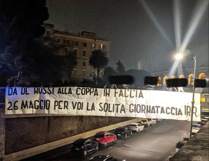 ROMA - Ancora una volta i tifosi della Lazio hanno voluto lasciare un messaggio ai propri dirimpettai cittadini della Roma. Questa notte sul solito ponte vicino al Colosseo, è stato esposto uno striscione per ricorda la data di oggi, ovvero 26 maggio. Da ricordare per i tifosi della Lazio che nel 2013 videro la propria squadra trionfare in finale di Coppa Italia, proprio contro la Roma. Una giornata indimenticabile anche per i tifosi giallorossi, che con dolore ricordano quella data indelebile: 26 maggio 2013. Oggi sono 6 anni da quella finale, ma è anche il giorno dell'addio alla Roma di Daniele De Rossi. Questo il messaggio dei laziali sullo striscione: "Da De Rossi alla Coppa in faccia, 26 maggio per voi la solita giornataccia".