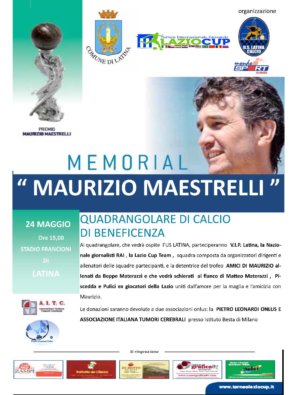 Il prossimo 24 maggio, alle ore 15:00, allo stadio Francioni di Latina ci sarà quadrangolare di calcio di beneficenza 'Memorial Maurizio Maestrelli'. Al quadrangolare, che vedrà ospita l'U.S. Latina, parteciperanno V.I.P. Latina, la Nazionale giornalisti Rai, la Lazio Cup Team, composta da organizzatori, dirigenti e allenatori delle squadre partecipanti e la detentrice del trofeo Amici di Maurizio allenata da Beppe Materazzi, al fianco di Matteo Materazzi, Massimo Piscedda e Felice Pulici ex giocatori della Lazio uniti per la maglia e per l'amicizia con Maurizio Maestrelli. Le donazioni saranno devolute a due associazioni: Pietro Leonardi Onlus e Associazione Italiana Tumori Cerebrali presso Istituto Besta di Milano. (RomaToday.it)