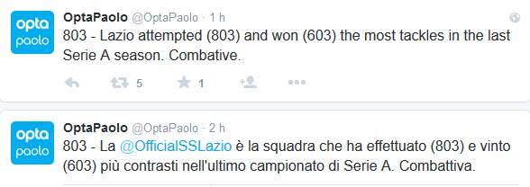 ROMA - Statistica interessante quella rilanciata in mattina da 'Opta | We Live Sport', agenzia che si occupa di statistiche. La Lazio infatti, in piena regola con i dettami del pressing voluti da Pioli, ha vinto la speciale classifica della Serie A per le squadre che hanno fatto più contrasti: 803. Di questi ben 603 quelli vinti. Eloquente il commento di Opta: "Combattiva".