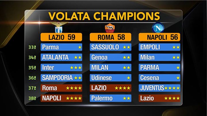 ROMA - Volata Champions secondo Premium. L'emittente satellitare ha asegnato delle stelle di difficoltà, da 1 a 4, alle prossime avversarie di Lazio, Roma e Napoli. Per i biancocelesti un percorso in salita che porta a una media di 2,66. Seguono il Napoli a 2,33 e la Roma a 2,16.