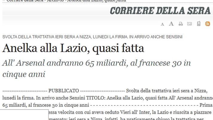 ROMA - Aveva 20 anni, era la Lazio di Cragnotti: Nicolas Anelka era praticamente un giocatore biancoceleste. C'era da sostituire Vieri, i dirigenti della Lazio lo stavano trattando: 19 giugno 1999, 65 miliardi pronti sul tavolo dell'Arsenal. "Svolta della trattativa ieri sera a Nizza, lunedì la firma - scriveva il Corriere della Sera - all' Arsenal andranno 65 miliardi, al francese 30 in cinque anni. Con la stessa velocita con cui aveva ceduto Vieri all' Inter, la Lazio è riuscita a piazzare il suo grande colpo di mercato: ieri sera a Nizza, infatti, ha praticamente chiuso la trattativa per Nicolas Anelka, il ventenne talento francese, titolare della nazionale transalpina. Sergio Cragnotti ha così sostituito Vieri con uno dei migliori attaccanti attualmente in circolazione in Europa e forse nel mondo, consegnando a Sven Goran Eriksson l' elemento che era in cima alla lista dei desideri. L' Arsenal, nonostante il tira e molla sul prezzo, accetterà dalla Lazio la non indifferente somma di 65 miliardi. Ad Anelka, invece, finiranno 6 miliardi netti a stagione per 5 anni. Il giocatore ha detto di sì e la stessa risposta è attesa dal club londinese nelle prossime ore".