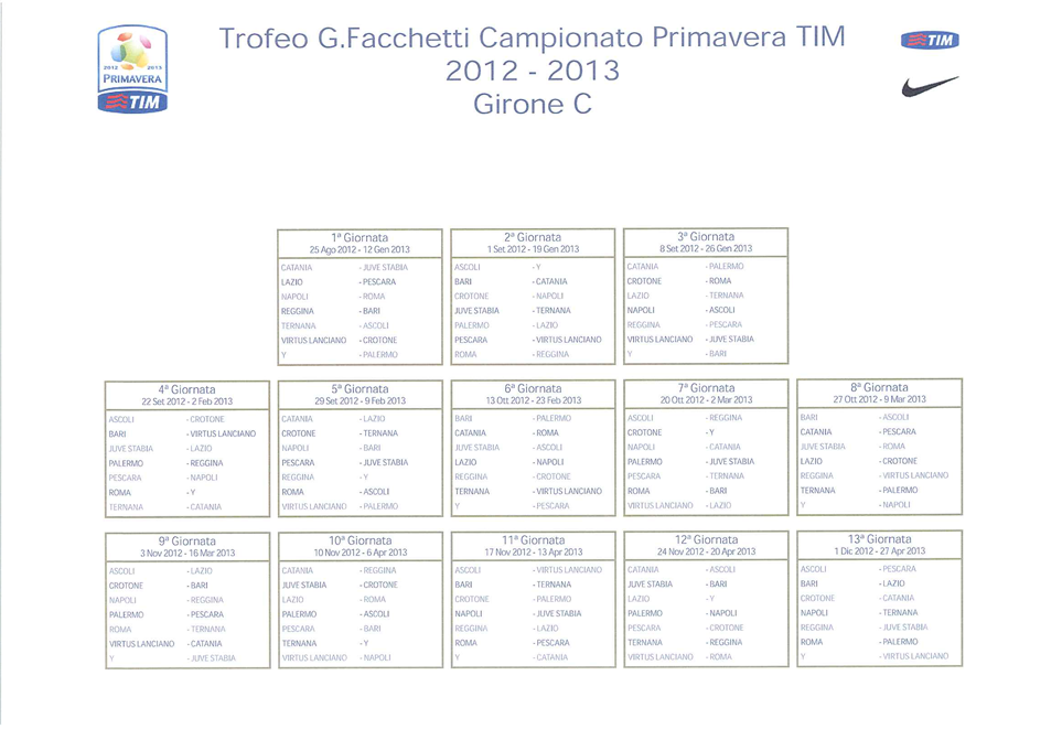 E' online, nella sezione "Bacheca" del sito legaseriea.it, il Comunicato Ufficiale n.23, con il calendario completo del Campionato Primavera TIM "Trofeo Giacinto Facchetti" 2012/2013. Puoi vedere la parte riservata alla Lazio, nell'immagine qui sotto. ( Clicca per ingrandire ) Rob.Mac. - Cittaceleste.it