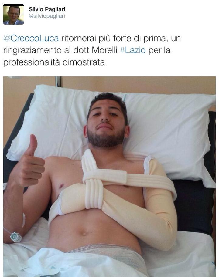 Luca ritornerai più forte di prima. Un ringraziamento al dott. Morelli della Lazio per la professionalità dimostrata". Questo è il personale messaggio dell'agente del giocatore Silvio Pagliari tramite il suo profilo twitter per Luca Crecco.