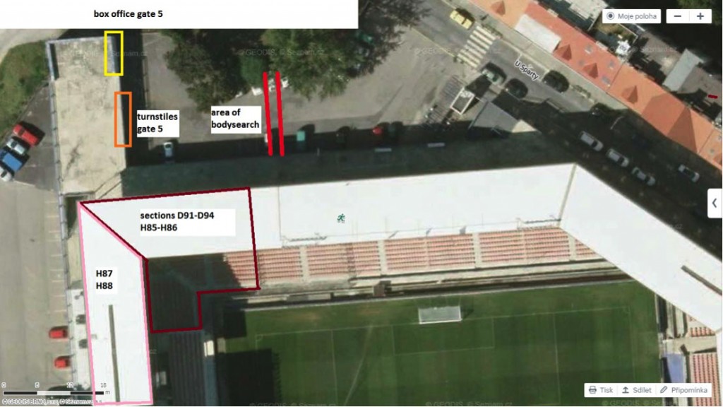 Il settore ospiti si compone di circa 1'200 posti a sedere. La SS Lazio ha ottenuto un aumento dei posti disponibili e pertanto sono stati messi in vendita 1'703 biglietti per tale settore. I segmenti centrali del settore sono denominati D91-D94 e H85-H86. L’intero settore ospite sarà segregato e protetto da stewards e polizia locale. Le regole di utilizzo dello stadio sono pubblicate all’indirizzo http://www.sparta.cz/novinky/zpravodajstvi/ostatni/vstupenky-na-lazio-17119.html. Qui di seguito si riepilogano i punti principali ai cui i sostenitori locali e ospiti dovranno attenersi scrupolosamente: