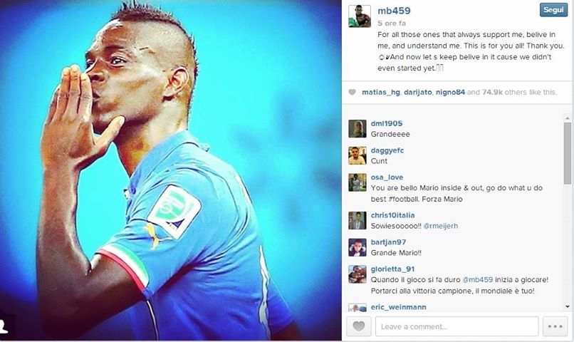 ROMA - Il giorno dopo la vittoria contro l'Inghilterra ha permesso a Mario Balotelli di scatenarsi a colpi di Social. Su Instagram il "Bad Boy" azzurro ha postato la foto che lo raffigura con il premio di Uomo Partita. "Oggi sono uomo partita! Che felicità, grazie ai miei compagni di squadra". Al rientro nel ritiro azzurro è stato letteralmente sommerso dai tifosi italiani insieme ad Andrea Pirlo. Poi un messaggio ai tifosi italiani: "Questo è un messaggio per tutti quelli che hanno creduto in me, che mi hanno aiutato e mi hanno capito. Ci dobbiamo credere, il bello deve ancora venire, non abbiamo ancora iniziato!". Lo spirito è quello giusto, abbiamo bisogno della sua forza e dei suoi gol per arrivare fino in fondo.