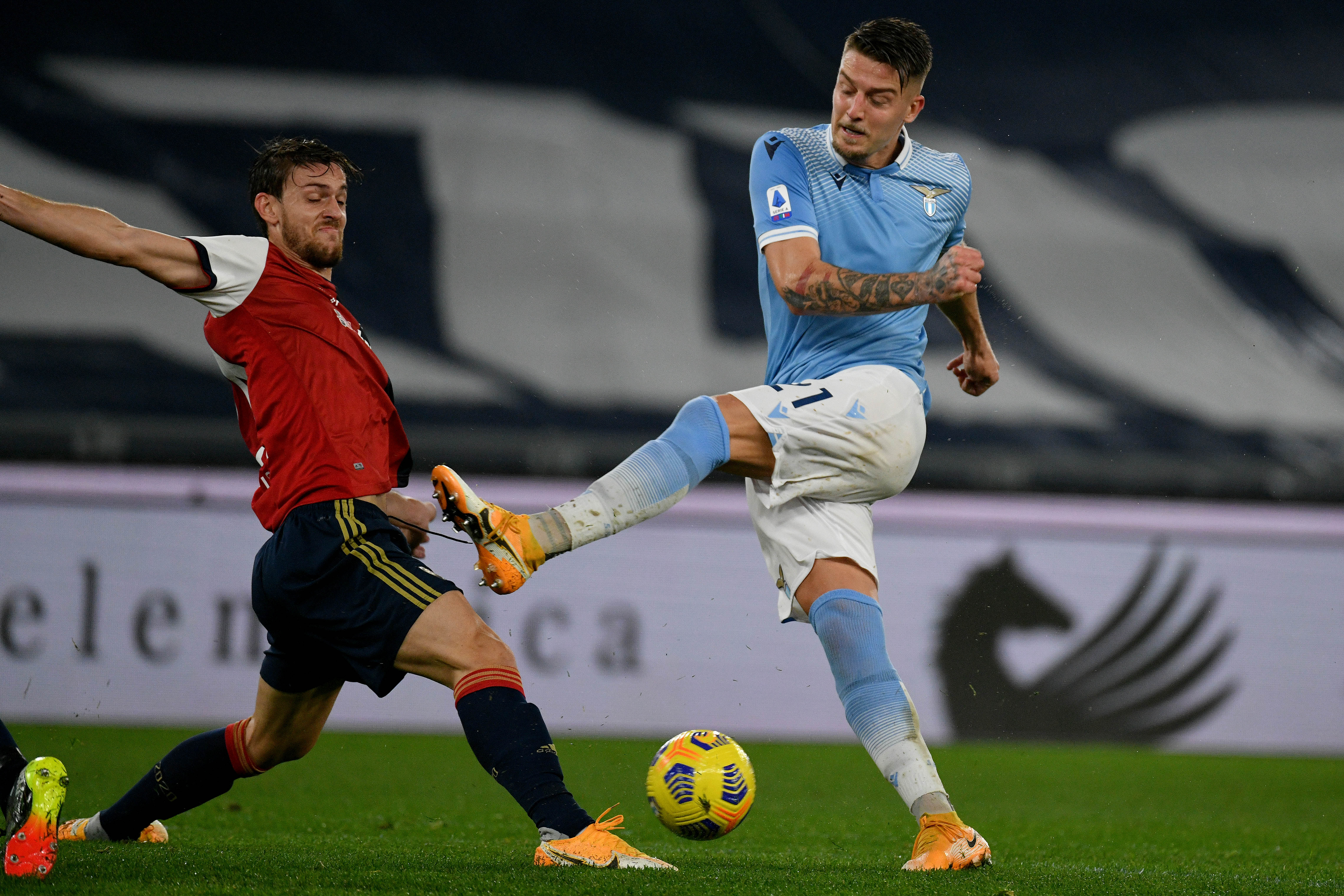 ROME, ITALY - FEBRUARY 07: Sergej Milinkovic-Savic of SS Lazio battles for a header with Paolo Farago of Cagliari during the Serie A match between SS Lazio and Cagliari Calcio at Stadio Olimpico on February 07, 2021 in Rome, Italy. Sporting stadiums around Italy remain under strict restrictions due to the Coronavirus Pandemic as Government social distancing laws prohibit fans inside venues resulting in games being played behind closed doors. (Photo by Paolo Bruno/Getty Images)