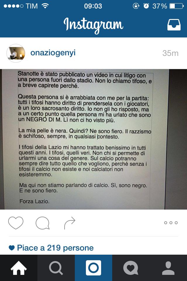 AGGIORNAMENTO ORE 8.40 - Onazi chiarisce la sua posizione su twitter: "Stanotte è stato pubblicato un video in cui litigo con una persona fuori dallo stadio. Non lo chiamo tifoso, e a breve capirete perché. Questa persona si è arrabbiata con me per la partita: tutti i tifosi hanno diritto di prendersela con i giocatori, è un loro sacrosanto diritto. Io non gli ho risposto, ma a un certo punto quella persona mi ha urlato che sono un negro di m****. Lì non ci ho visto più. La mia pelle è nera. Quindi? Ne sono fiero. Il razzismo è schifoso, sempre, in qualsiasi contesto. I tifosi della Lazio mi hanno trattato benissimo in tutti questi anni. I tifosi, quelli veri. Non chi si permette di urlarmi una cosa del genere. Sul calcio potranno dire sempre tutto quello che vogliono, perché senza i tifosi il calcio non esiste e noi calciatori non esisteremmo. Ma qui non stiamo parlando di calcio. Sì, sono negro. E ne sono fiero. Forza Lazio."